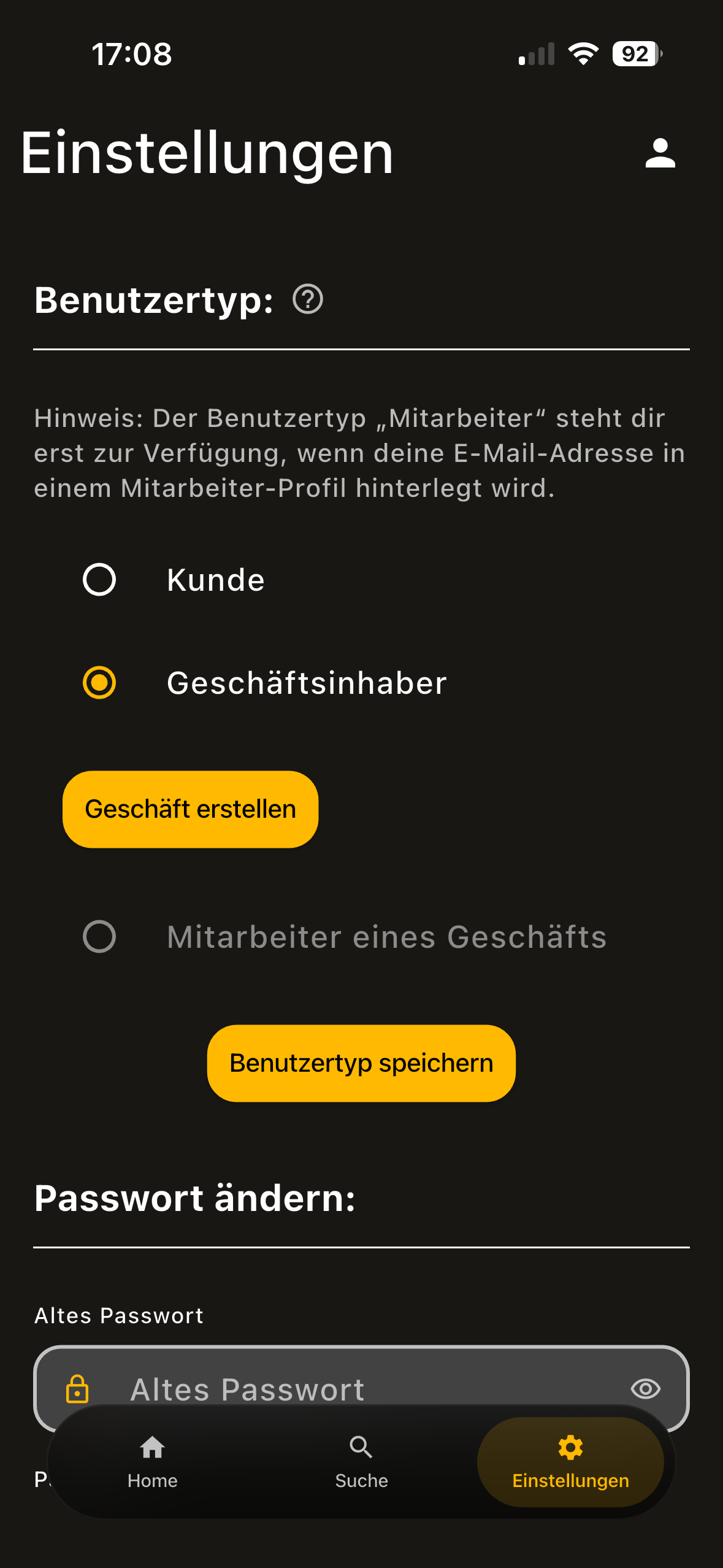 Geschäft anlegen: In den Einstellungen findest du den Abschnitt „Benutzertyp“ und den Button „Geschäft registrieren“. Darüber legst du dein erstes Geschäft an (siehe Screenshots unten).