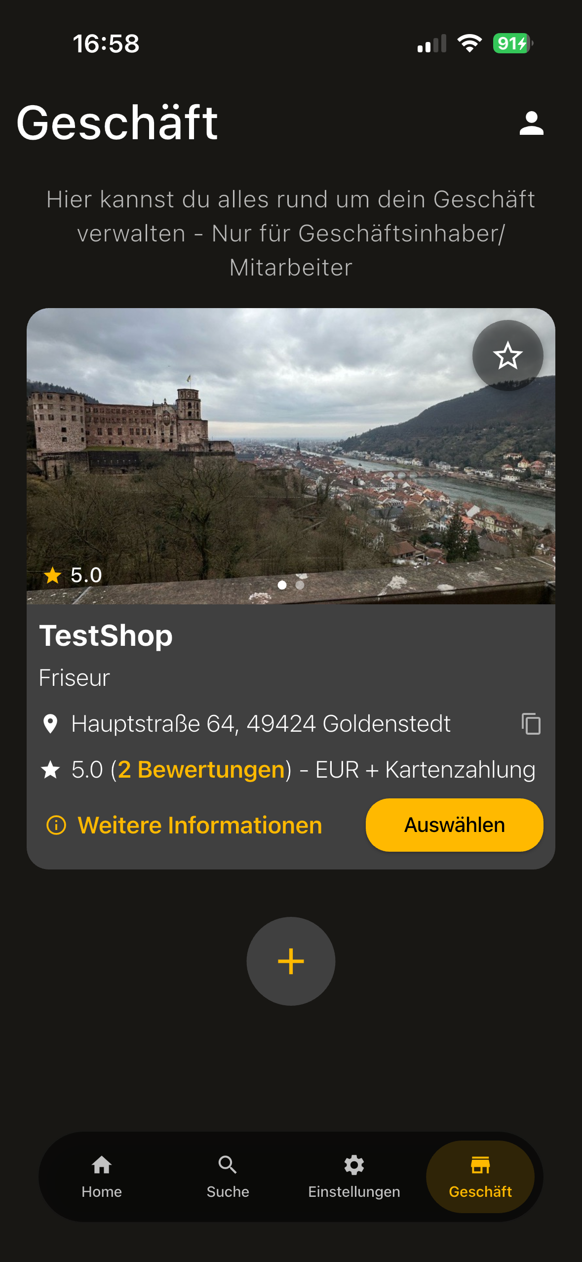 - Geschäft (in der Navigationsleiste unten): Hier verwaltest du immer dein Geschäft – Daten, Buchungen, Mitarbeiter, Services usw.